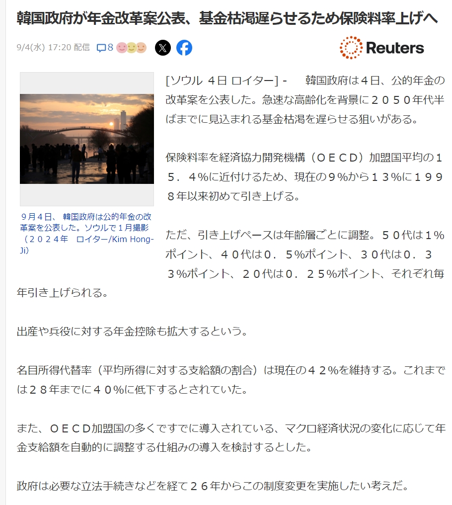先細りは明白だが日本の政治家は無能ばかりで、問題は常に先送り。韓国が国民年金やめたら、為替介入する金がなくなるだろw