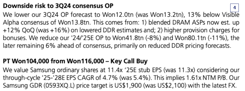 1日、韓国投資証券はサムスン電子の目標株価を従来の9万6000ウォンから8万3000ウォンに引き下げ、会社がHBMの第5世代改善製品を追加で準備すると言及したことについて、「内部での認証と新規サンプルに対する顧客企業の認証が必要なため、量産スケジュールが遅れ、販売計画が修正されるだろう」とし、「メモリーでHBMの販売拡張がライバル企業より遅れ、ファウンドリーの需要の回復時点が予想より遅くなり、当分は実績に期待を持つことは難しいと判断する」と明らかにした。