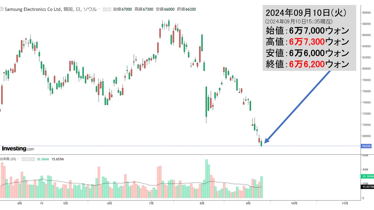直近は「なんだこりゃ」という下落トレンドですが、09月10日の終値は「6万6,200ウォン」