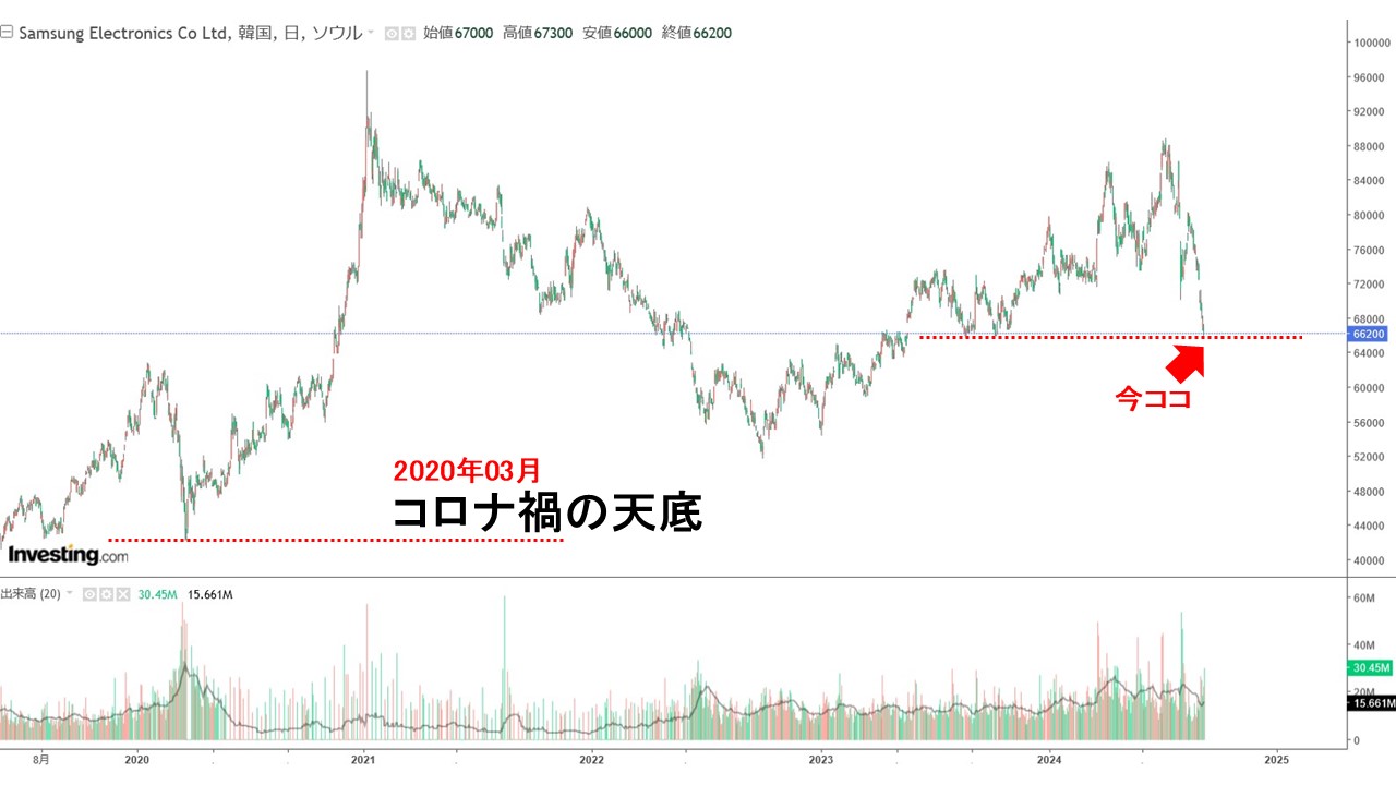 韓国『サムスン電子』の株価が絶不調で、ずんずん下がっています。