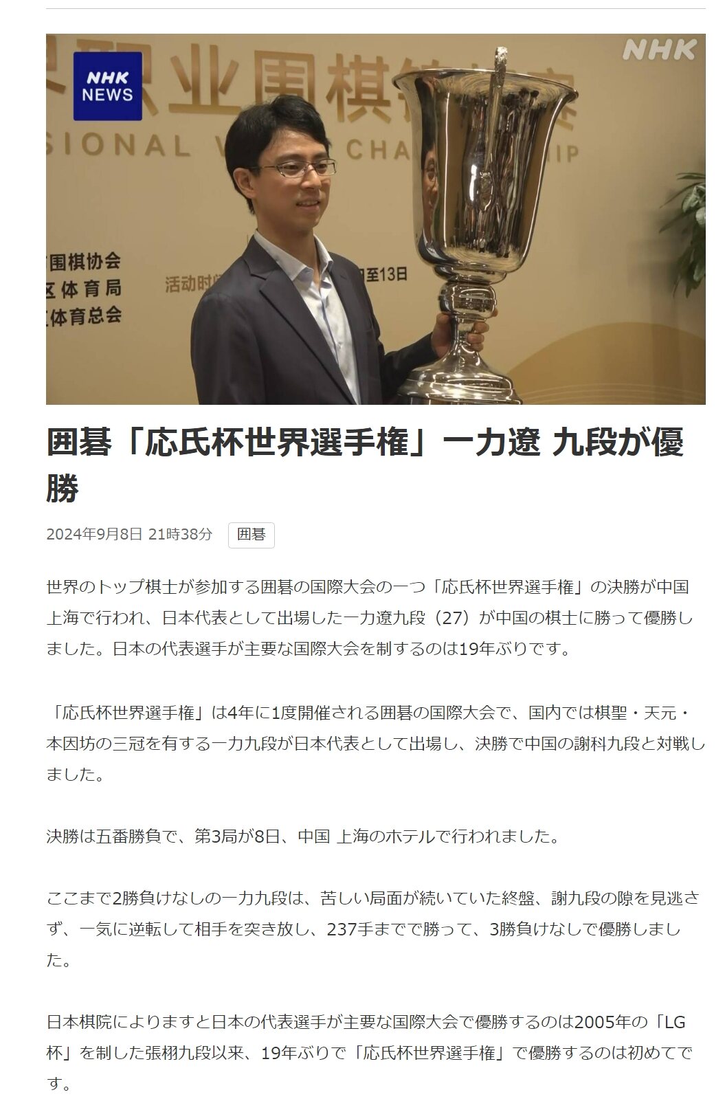 世界のトップ棋士が参加する囲碁の国際大会の一つ「応氏杯世界選手権」の決勝が中国 上海で行われ、日本代表として出場した一力遼九段(27)が中国の棋士に勝って優勝しました。日本の代表選手が主要な国際大会を制するのは19年ぶりです。