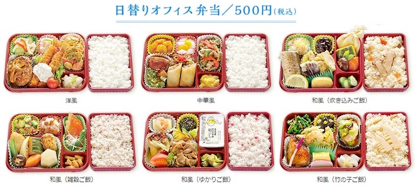 その代わり、オフィス密集地帯で配達弁当の競争が激しくて、こちらは 300~350円でちゃんとした食事ができた。今は550円に上がってしまった。価格的には、おおよそ吉野家の牛丼並と連動していて、メニューが2週間で1巡するようになっていて季節ごとに代わる。コンビニ弁当に比べて、量も多いし、おかずも栄養を考えて色々な種類が混ざっているから、すごく割安。(画像は出入りしていた「玉子屋」さんのメニュー例)