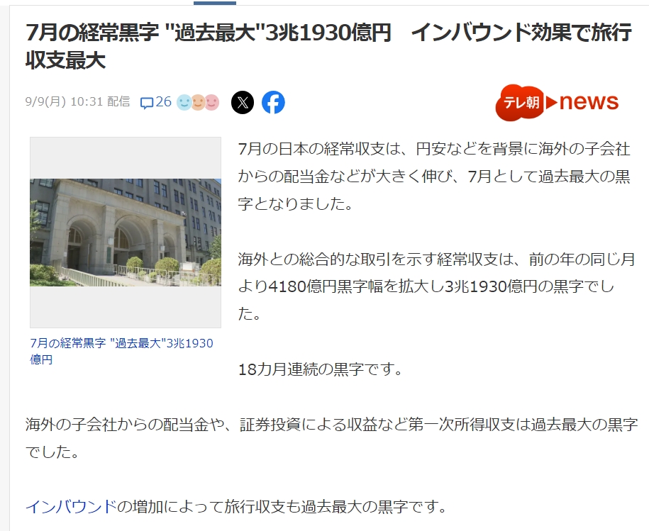 7月の経常黒字 "過去最大"3兆1930億円 配当金や直接投資による収益の黒字幅が拡大