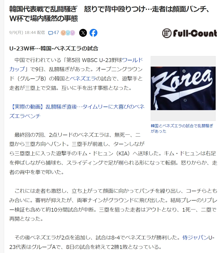 韓国とベネズエラの試合で乱闘騒ぎがあった