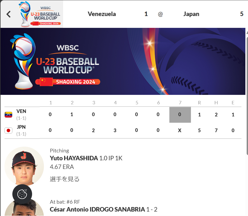その後ベネズエラが2点を追加し、試合は8-4でベネズエラが勝利した。侍ジャパンU-23代表はグループAで、8日の試合を終えて2勝1敗となっている。