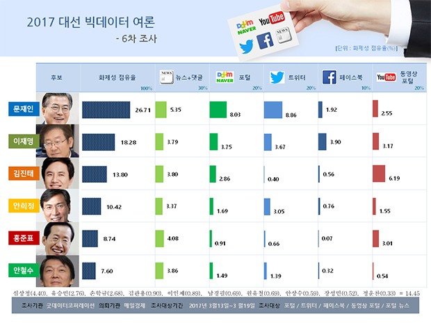 알앤써치가 29일 발표한 3월 5주차 ‘빅6 차기 대선 후보 지지율’ 조사결과에 따르면 문재인 민주당 전 대표는 33.0%로 1위를 지켰다.