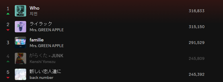 逆に、上がる理由がないのに上がる方が捏造の証明になるwApple music ではデイリー100位にも入らないのに、Spotify ではデイリー1位、2位。