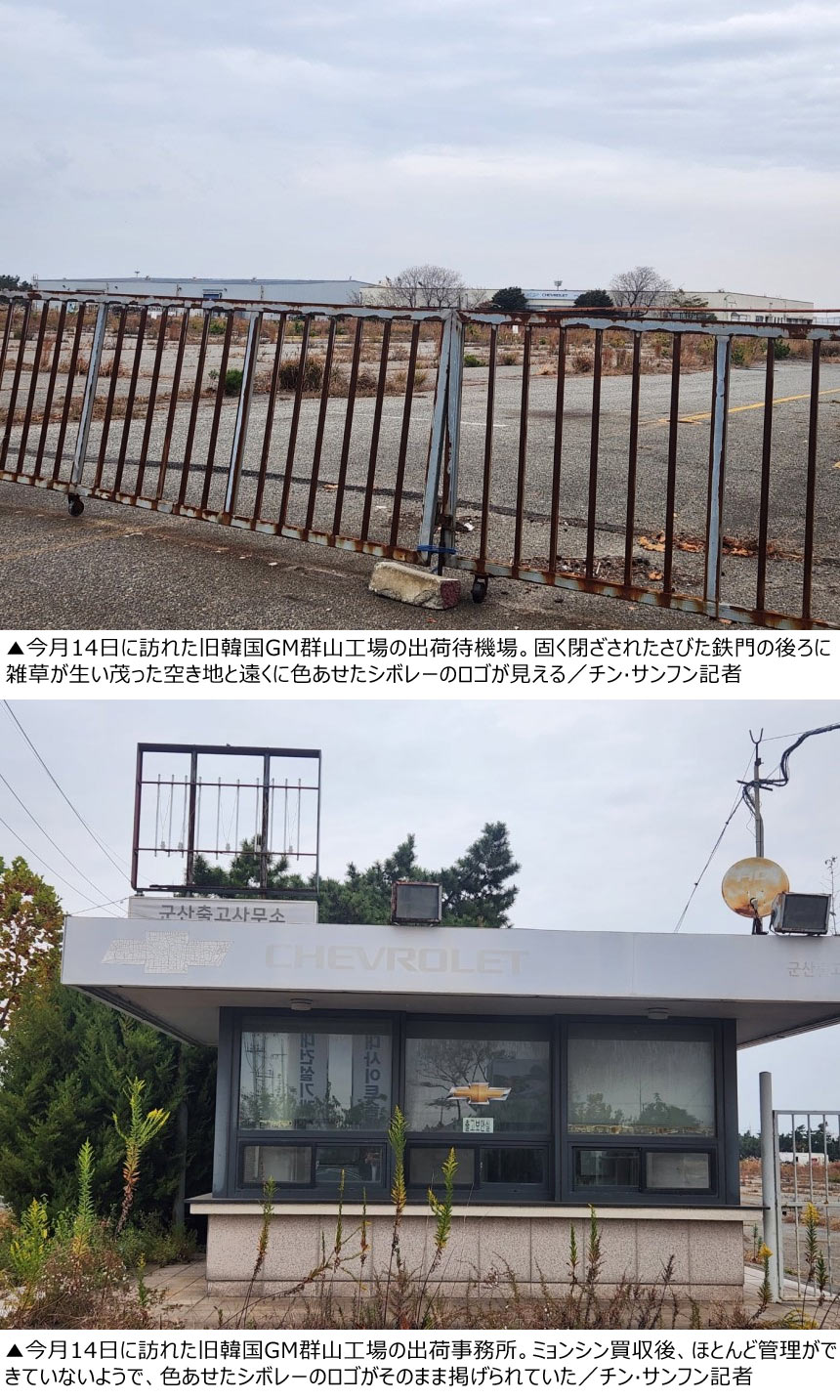 同日夕方に訪れた旧韓国GM群山工場は、物寂しい雰囲気が漂っていた。かつて工場で生産された数千台の車でぎっしり埋まっていた出荷待機場は、雑草だけが生い茂り、廃墟のように放置されていた。ミョンシンが買収した後、ほとんど管理をしていないようで、鉄門はさびついたまま固く閉ざされていた。出荷事務所もゼネラルモーターズ(GM)のシボレーブランドのマークが色あせたまま残っていた。