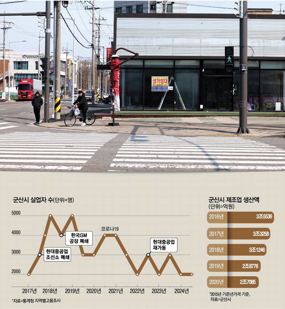 韓国GM工場の閉鎖は群山地域の製造業生産にも影響を与えた。 群山市が提供したデータ(2015年基準年価格基準)によると、2017年3兆3258億ウォンだった群山市の地域内製造業生産額は2018年3兆1246億ウォン、2019年2兆8776億ウォン、2020年2兆7085億ウォンで着実に減少し、2021年にも3兆532億ウォンで工場閉鎖以前の数字を回復できなかった。