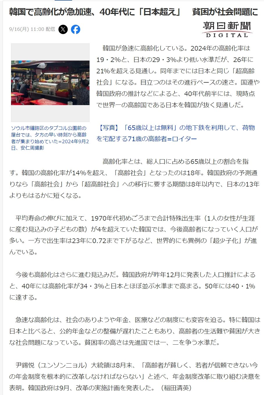 韓国が急速に高齢化している。2024年の高齢化率は19・2%と、日本の29・3%より低い水準だが、26年に21%を超える見通し。同年までには日本と同じ「超高齢社会」になる。目立つのはその進行ペースの速さ。国連や韓国政府の推計などによると、40年代前半には、現時点で世界一の高齢国である日本を韓国が抜く見通しだ。