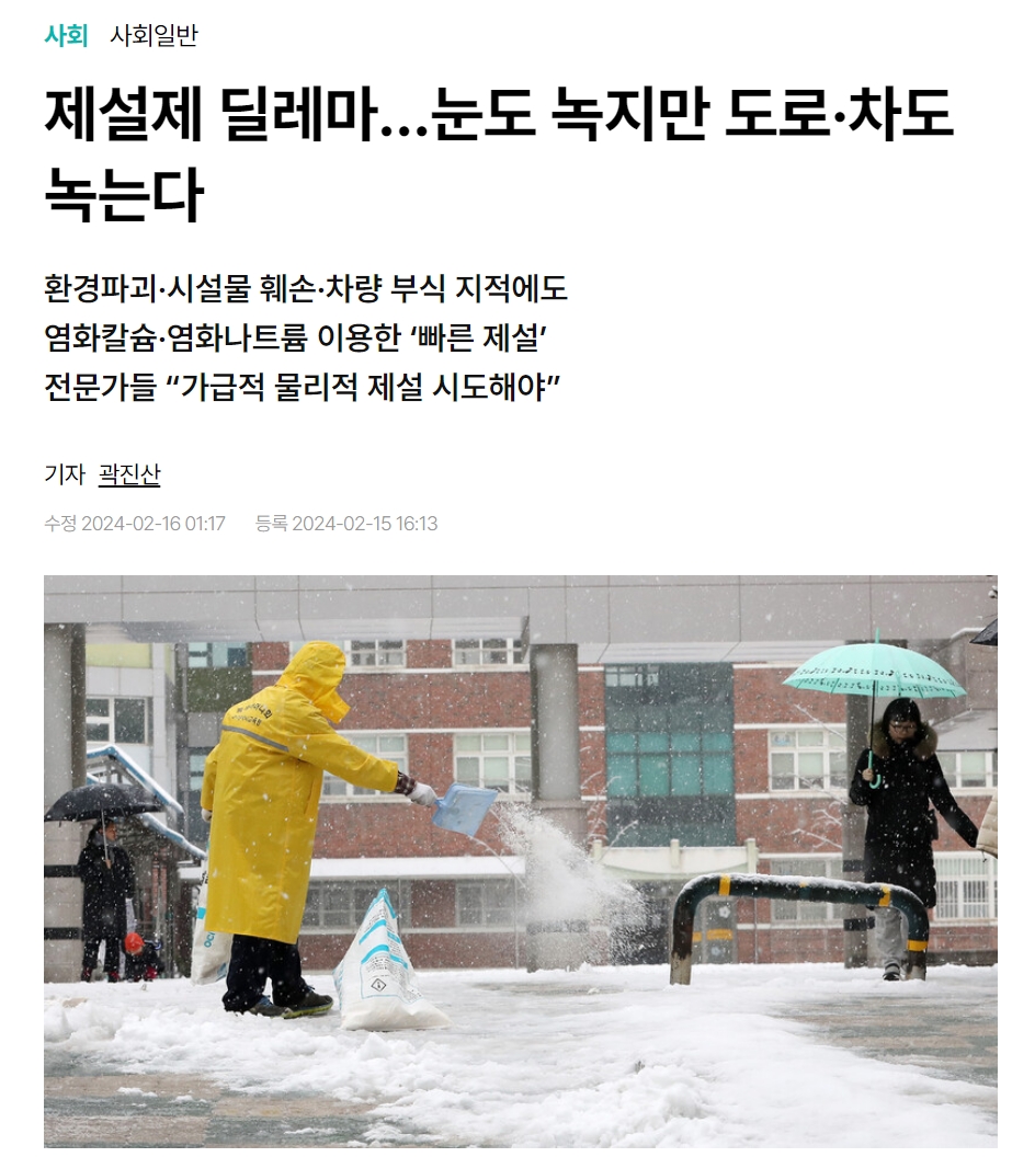 雪の結氷を防ぐための除雪剤として最も多く使われるのは塩化カルシウム、塩化ナトリウム(工業用塩)などだ。 ソウル市の場合、1年の冬に4万トン(t)以上の除雪剤を使うが、約80%がこれらの成分だ。 しかし、塩化カルシウムなどの除雪剤は道路を腐食させるだけでなく、街路樹などの生態系にも悪い影響を与えかねない。 専門家らは、乱用を減らす悩みが必要だと指摘する。除雪剤(融雪剤)の除去作業www