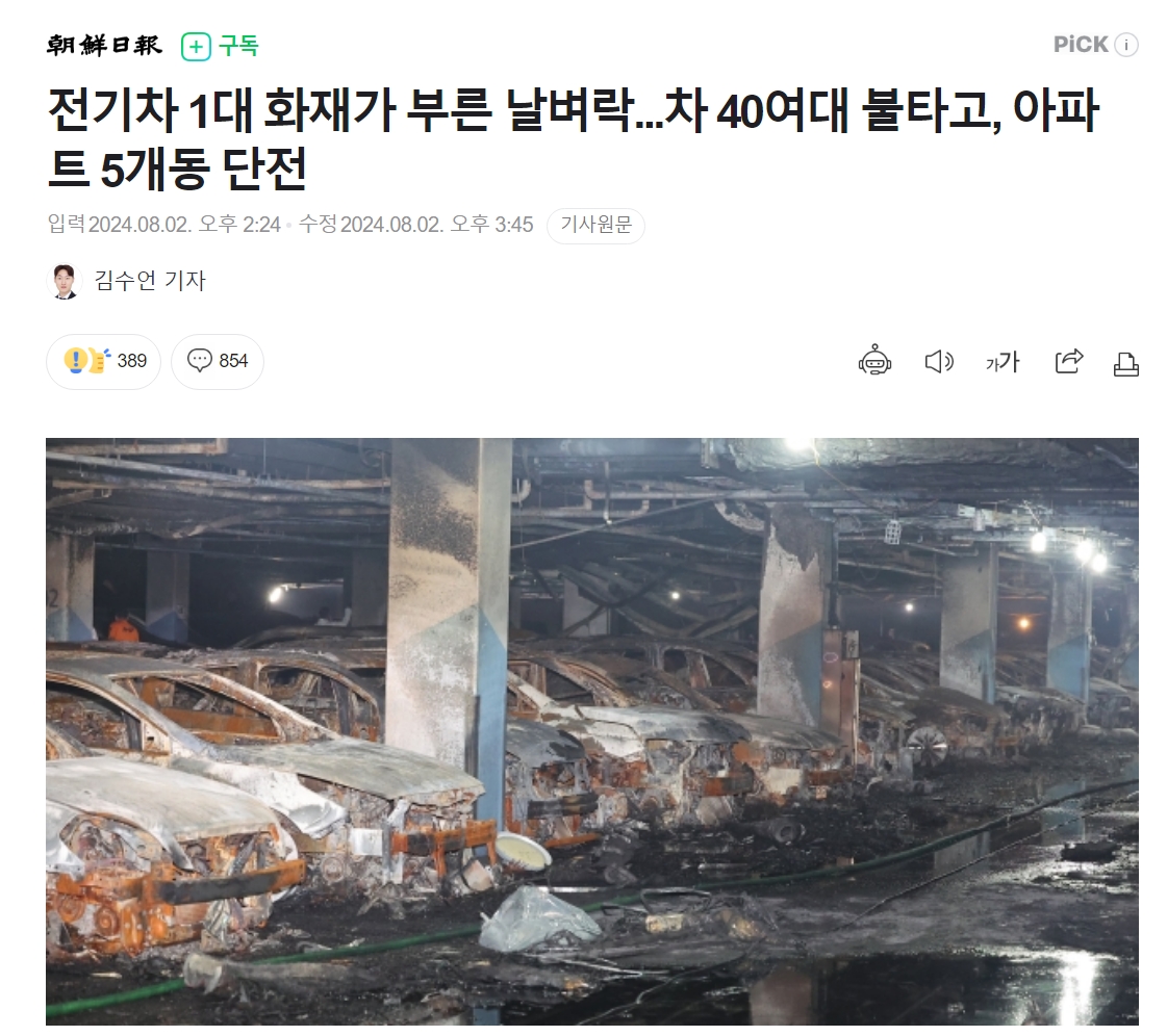 電気自動車1台の火災が招いた災い…車両40台余りが燃え、マンション5棟停電