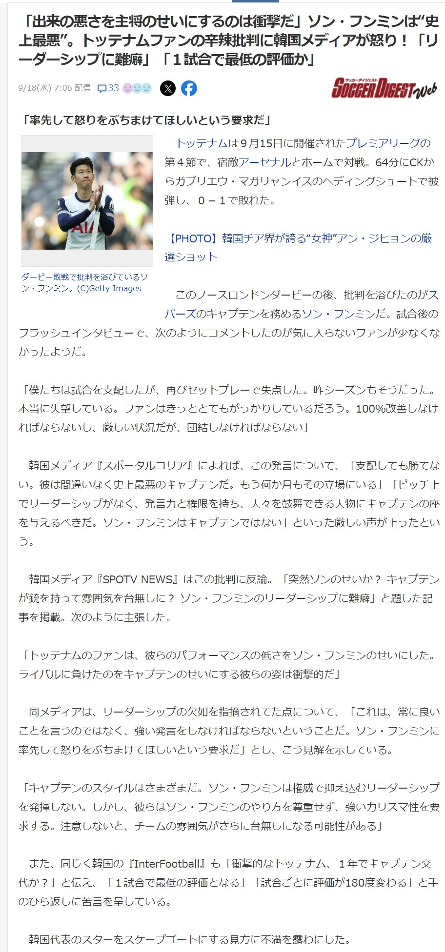 同メディアは、リーダーシップの欠如を指摘されてた点について、「これは、常に良いことを言うのではなく、強い発言をしなければならないということだ。ソン・フンミンに率先して怒りをぶちまけてほしいという要求だ」とし、こう見解を示している。