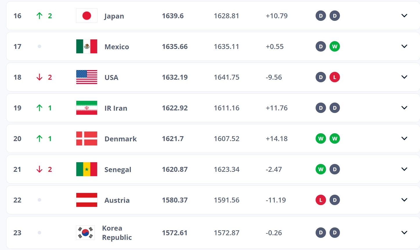 同じアジア勢ではトップの日本に次ぎ、イラン(19位/1ランクアップ)、韓国(23位/変動なし)、オーストラリア(25位/1ランクダウン)と続く並びに。トップ5は先月発表のランキングから不変で、1位アルゼンチン、2位フランス、3位スペイン、4位イングランド、5位ブラジルとなった。韓国が日本よりFIFAランキングが上だった時が思い出せない