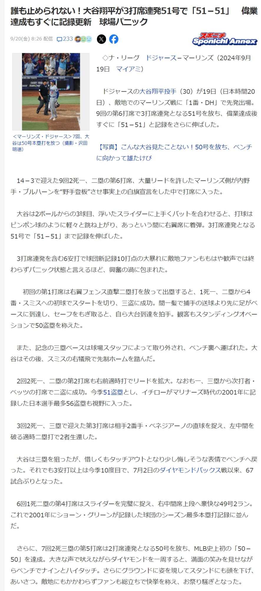 ドジャースの大谷翔平投手(30)が19日(日本時間20日)、敵地でのマーリンズ戦に「1番・DH」で先発出場。9回の第6打席で3打席連発となる51号を放ち、偉業達成後すぐに「51-51」と記録をさらに伸ばした。