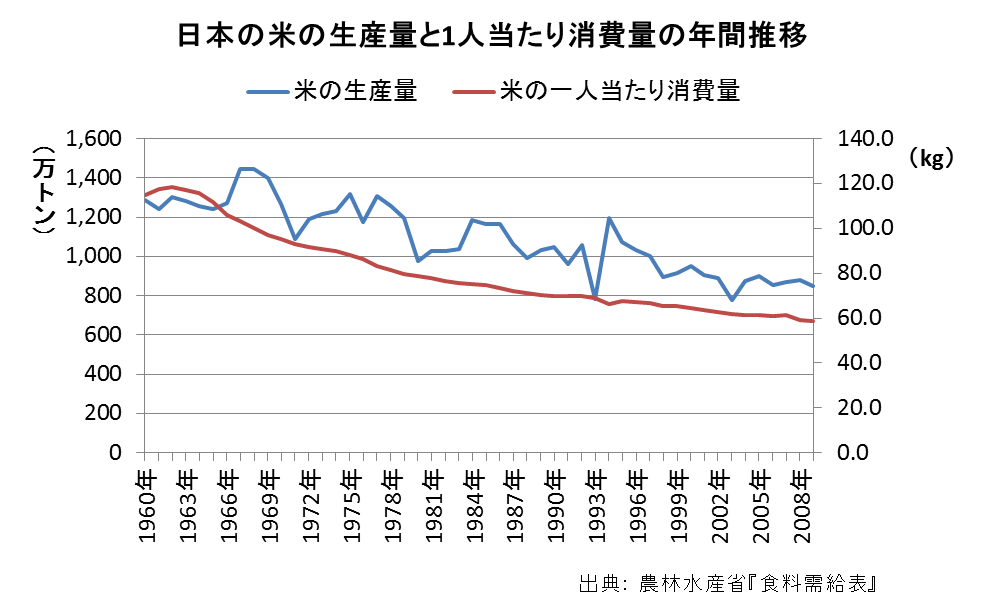 輸出量が2万4469トン だけれど、これは令和5年の主食用米生産量 661万t の0.36% くらいの値 。米生産量自体は800万tくらいみたい。ちなみに日本の米生産量は年平均10万トンくらい減っていて、そちらの方が多い(画像)