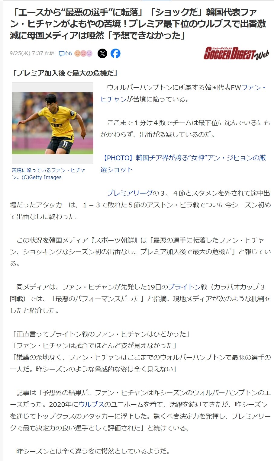 同メディアは、ファン・ヒチャンが先発した19日のブライトン戦(カラバオカップ3回戦)では、「最悪のパフォーマンスだった」と指摘。現地メディアが次のような批判をしたと紹介した。