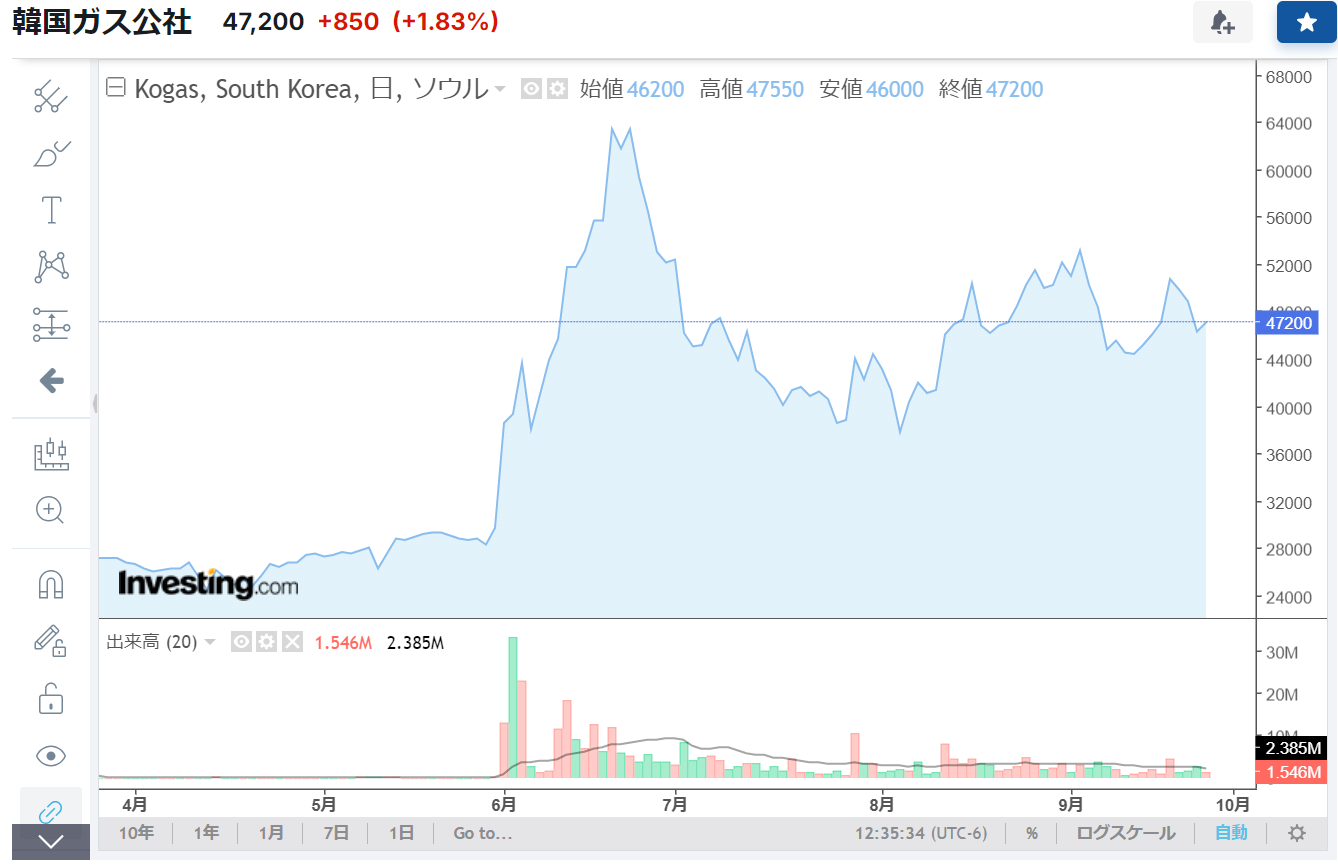 ここで一度、韓国ガス公社の株価を見てみましょう♪