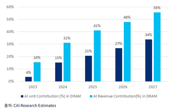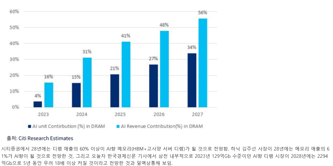 シティ証券で28年にはディーラム売上の60%以上がAI向けメモリー(HBM+高仕様サーバーディーラム)になると展望した。 ハニックのキム·ジュソン社長が28年にはメモリー売上の61%がAI向けになると展望したこと、そして今日付の韓国経済新聞の記事で、サムジョン内部的に2023年129億Gb水準だったAI向けDRAM市場が2028年には2294億Gbで5年間でなんと18倍以上大きくなると展望したことと一脈相通じるようだ。