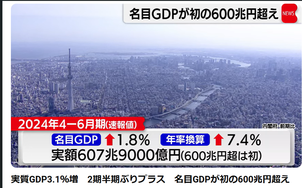 2名無し2024/09/25(Wed) 23:20:06ID:U4NTcxNTA(1/1)NG報告>>1実際は・・(笑)2024年4-6月期(速報値)名目GDP600兆円超え=607兆9000億円実質GDP(年率換算)3.1%↑のプラス成長個人消費1.0%↑プラス設備投資0.9%↑プラス--------------------------------韓国、第2四半期-0.2%成長>>235