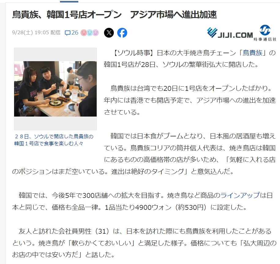 韓国では日本食がブームとなり、日本風の居酒屋も増えている。鳥貴族コリアの筒井信人代表は、焼き鳥店は韓国にあるものの高価格帯の店が多いため、「気軽に入れる店のポジションはまだ空いている。進出は絶好のタイミング」と意気込んだ。