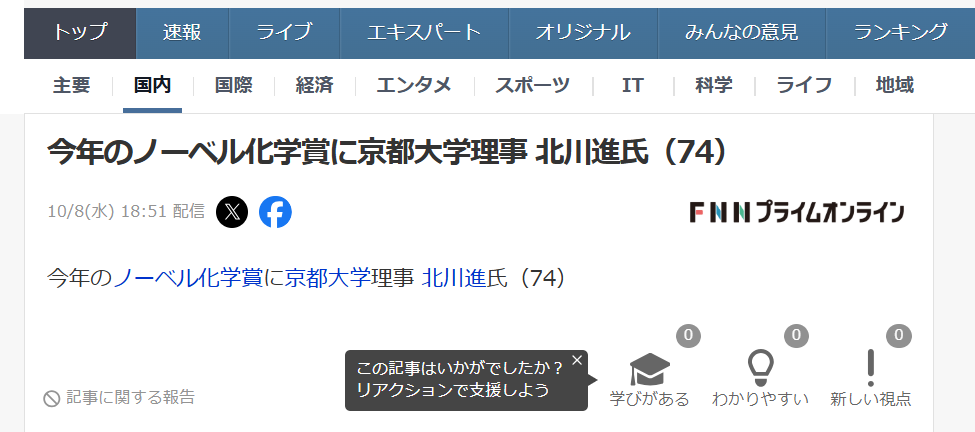 また日本人がノーベル化学賞とっちゃったよ