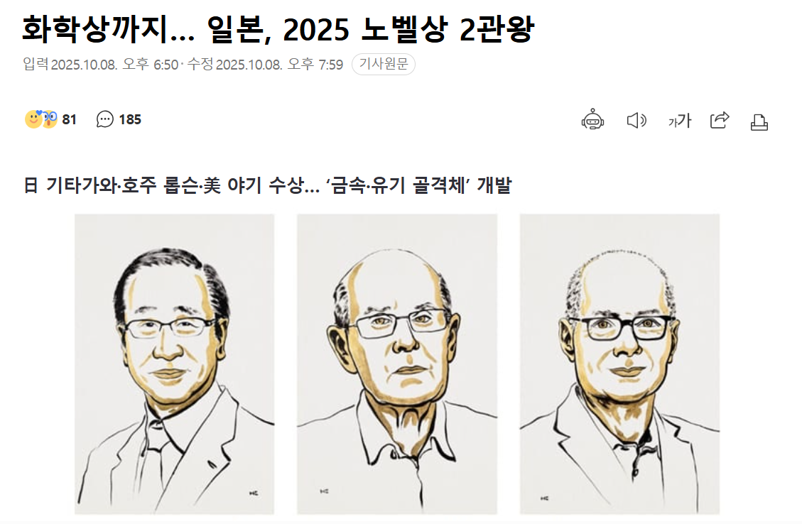 スウェーデンの王立科学アカデミーは8日、2025年のノーベル化学賞を、北川進・京都大特別教授ら3氏に贈ると発表した。