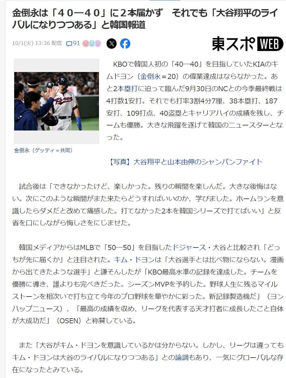 また「大谷がキム・ドヨンを意識しているかは分からない。しかし、リーグは違ってもキム・ドヨンは大谷のライバルになりつつある」との論調もあり、一気にグローバルな存在になったとみている。キムドヨン保有国。wwwww