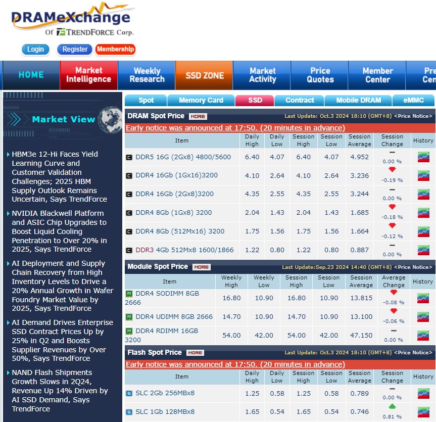 NANDフラッシュの取引価格も10%以上落ちています。例えばNANDフラッシュ汎用製品「128Gb16Gx8 MLC」の09月平均取引価格は4.34ドルで対前月比11.44%の下落です。NAND価格が下落傾向を見せるのは2023年03月以来のことです。