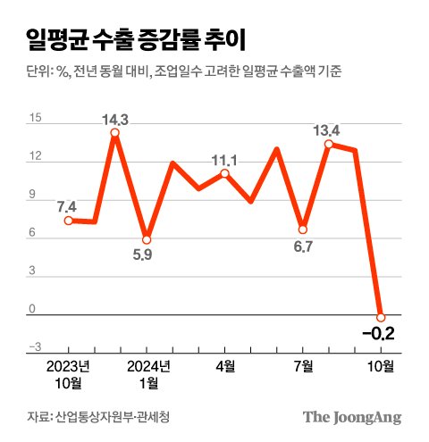 しかし、実際の操業日数を考慮して算出する10月の日平均輸出はむしろ0.3%減少した26億1000万ドルを記録した。韓国輸出が鈍化税に入ったという解釈が出ている。 「半導体と船舶を除いた(10月)日平均輸出は5.1%減少した」とし「輸出増加率は来年上半期まで下落すると見込まれる」と明らかにした。