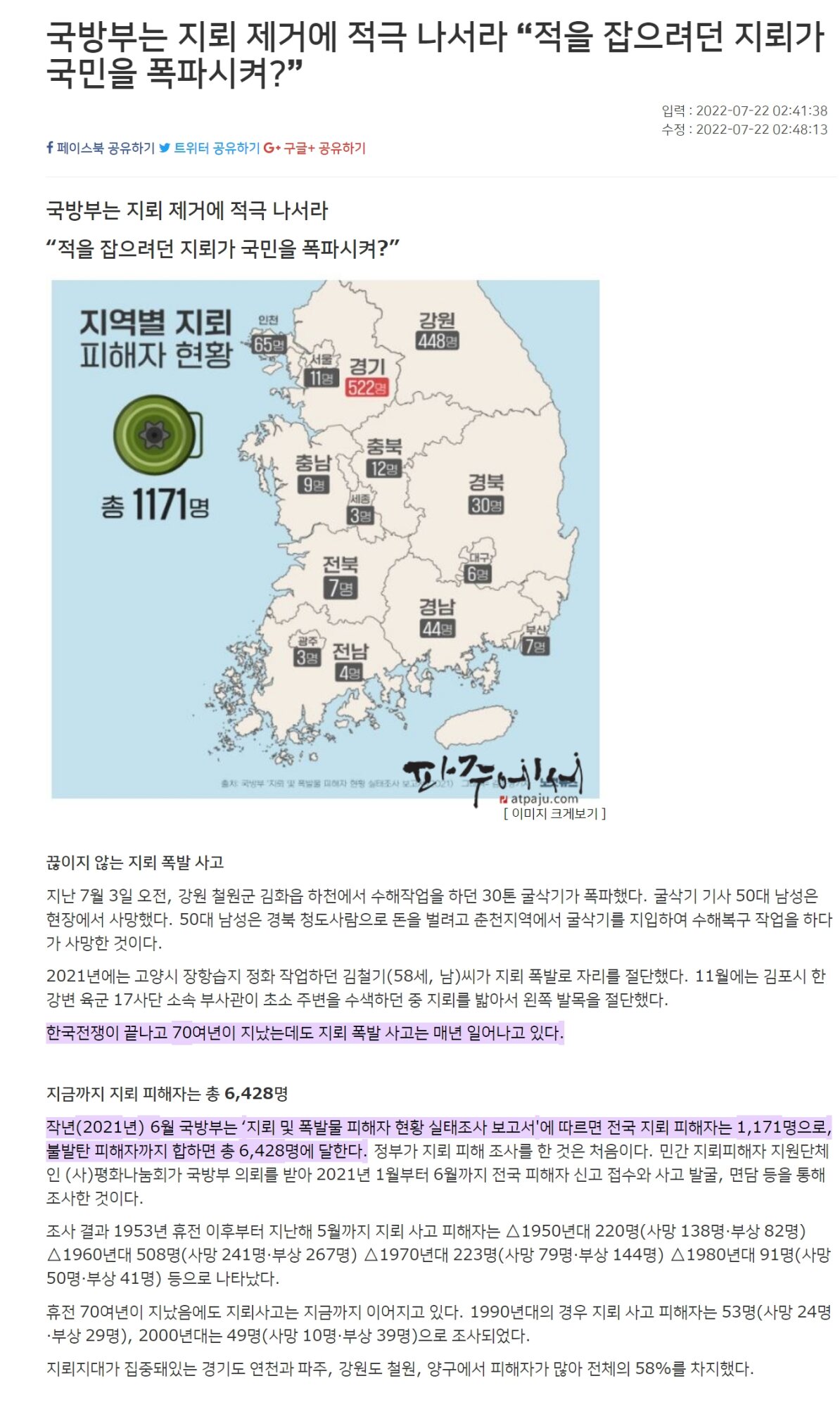 老害くんは病気だからそっとしておいてあげてね。昨年(2021年)6月、国防部は「地雷および爆発物被害者現況実態調査報告書」によれば、全国地雷被害者は1,171人で、不発弾被害者まで合わせれば計6,428人に達する。