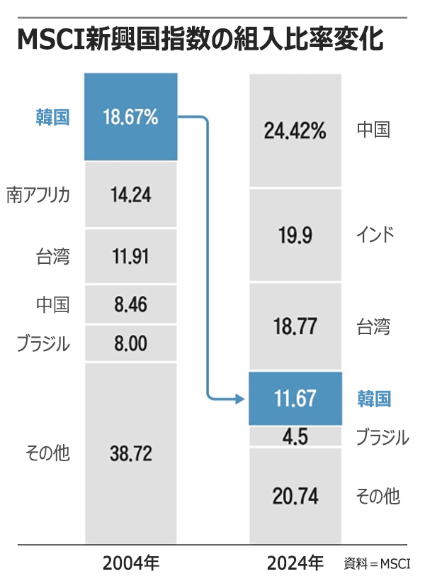 株価指数大手モルガン・スタンレー・キャピタル・インターナショナル(MSCI)によると、韓国のMSCI新興国指数への組入比率は2004年時点でトップの18.67%だったが、今年は中国(24.42%)、インド(19.90%)、台湾(18.77%)に続く4位(11.67%)へと7ポイントも後退した。同じ期間に台湾の組入比率は11.91%から18.77%へと6.86ポイント上昇した。韓国と台湾の地位が逆転したことになる。中国は8.46%から24.42%に、インドは4.93%から19.9%にそれぞれ急上昇した。