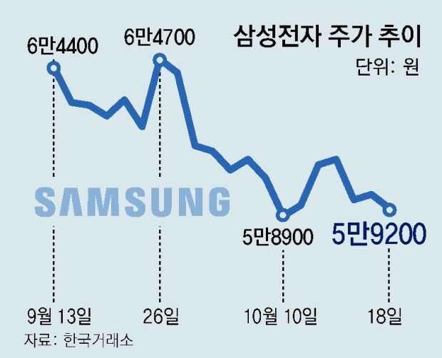サムスン電子が昨日発表した7-9月期の業績(暫定値)によると、売上高は前期比6.66%増の79兆ウォン(約8兆7140億円)で過去最高となった。しかし営業利益は前期比12.84%減の9兆1000億ウォンだった。すでに下方修正された市場の予測値10兆ウォン台を下回り、株価下落は続いた。株式市場で外国人投資家は3カ月ぶりに(サムスン電子株)売り越しに転じた。時価総額に対する比率も2年ぶりに最低値となった。