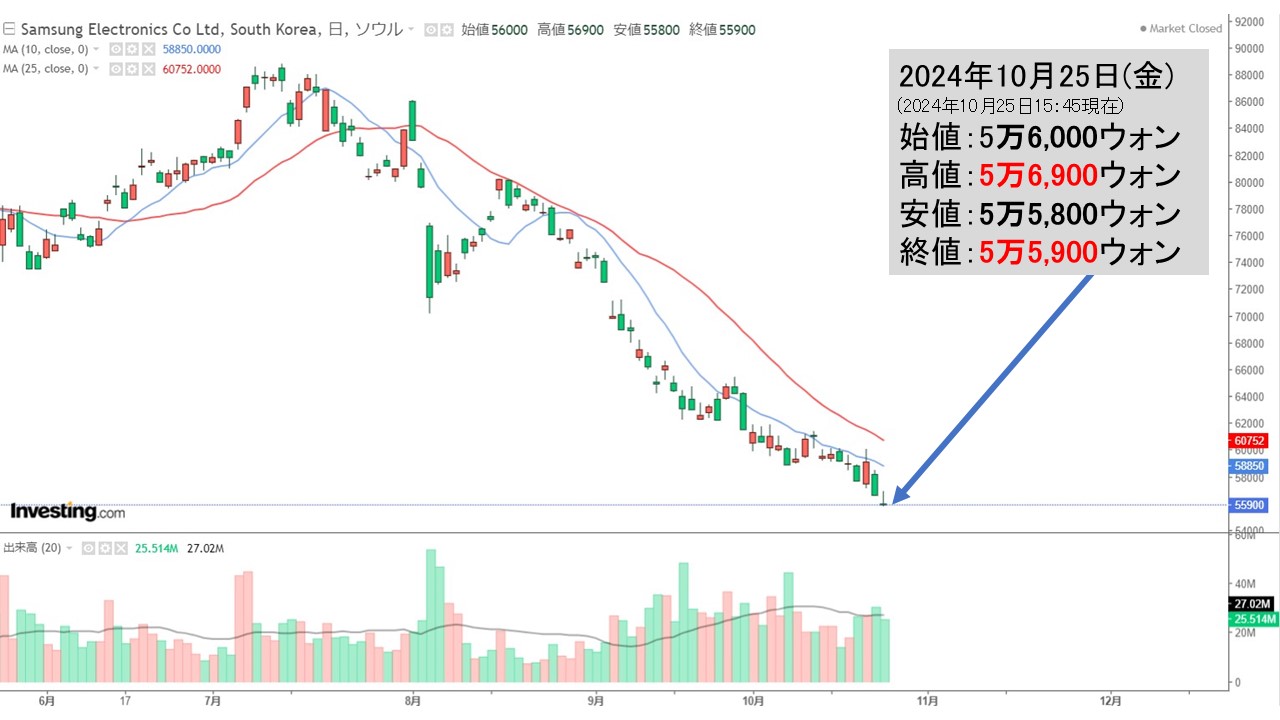 2024年07月第1週目「始値:8万7,900ウォン」から直近10月第4周目「終値:5万5,900ウォン」まで、実に36.4%も株価は下落し、約191兆ウォンが蒸発しました。