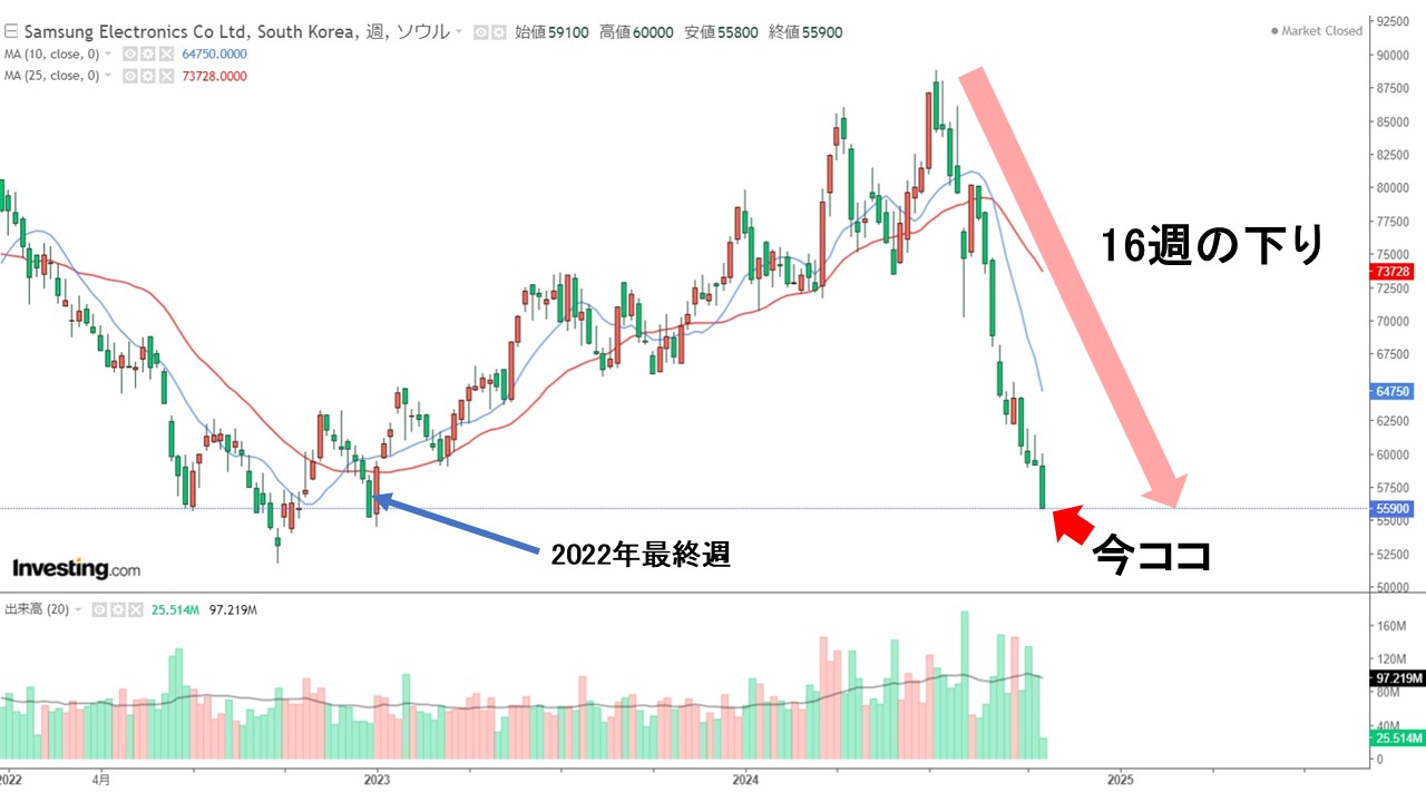 直近では4週続けての下落。16週の下りトレンドで、株価は2022年最終週の水準まで落ちました。