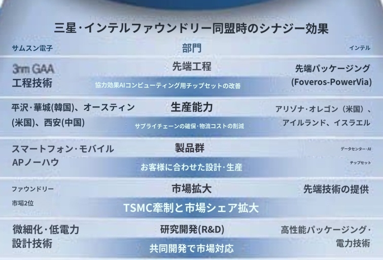 三星電子は微細工程で性能と電力効率を高める「3ナノGAA(ゲートオールアラウンド)」という技術力を保有しており、インテルは異なる工程で生産されたチップを一つのパッケージに結合できるポベロス(Foveros)や電力効率性を高めるパワービア(PowerVia)技術力を保有している。 高性能と低電力設計が重要な人工知能(AI)、データセンター、モバイルAP(アプリケーションプロセッサ)を共同開発できる部分だ。