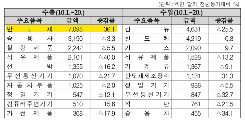 2024年10月21日、韓国の関税庁が「2024年10月01~20日の輸出入現況」を公表しました。以下をご覧ください。