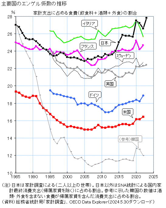 (注)日本は家計調査による(二八以上の世帯)。日本以外はSNA統計による国内家 計最終消費支出(帰属家賃を除く)に占める割合。参考に示した韓国の数値は酒