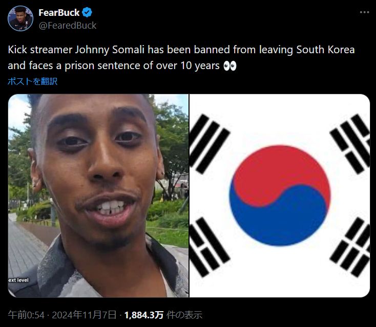 https://x.com/JohnnySomali_TV「少女像侮辱」迷惑系ユーチューバー、「コンビニで騒動」…業務妨害容疑で起訴=韓国