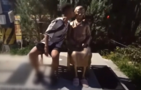 #【写真】ジョニー・ソマリが少女像の銅像にキスする姿