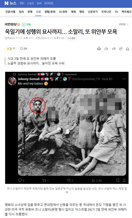 ソマリは旭日旗の写真を掲載し、慰安婦被害者に向かって持続的に「売春婦」と表現する書き込みを相次いで掲載した。過去の言動に対しては先日の謝罪で十分だったかのように「私はすべての罪を洗い流した」とも書き込んだ。