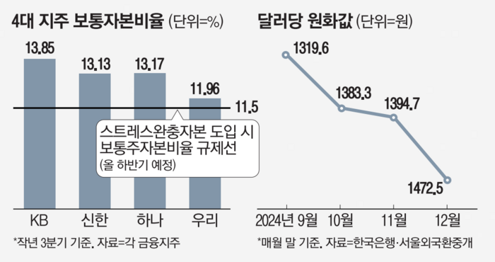 CET1比率は金融会社の損失吸収能力を示す指標であり、危機にどれほど能動的に対応できるかを示している。 ウォン貨価格が現在の傾向どおり下落すれば金融持株がバリューアップ構想を発表する時に公約した13%水準を下回ることができ、買収·合併(M&A)など未来成長動力発掘にもブレーキがかかる恐れがあるという憂慮が出ている。