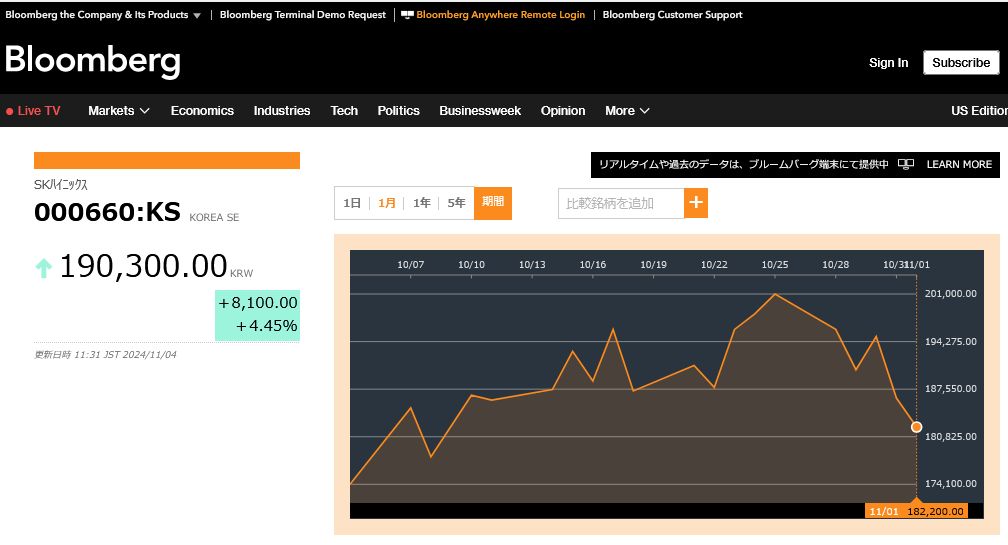 SKハイニックスも下落した。同株は3.94%(7900ウォン)安の19万2600ウォン(約2万1200円)で取引を終えた。外国人投資家が109億ウォン(約12億円)、機関投資家が710億ウォン(約78億円)売り越した。