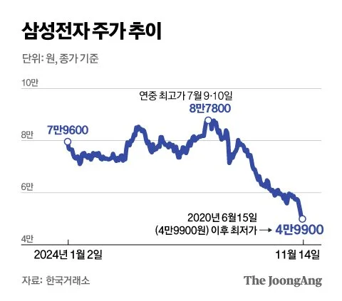 この日の韓国取引所の集計によると、サムスン電子は前取引日の終値に比べて3.51%(2000ウォン)下落の5万5000ウォン(約6040円)で取引を終えた。これまでの52週間の最低価格である10月25日の終値5万5900ウォンに比べても、さらに900ウォン安い。