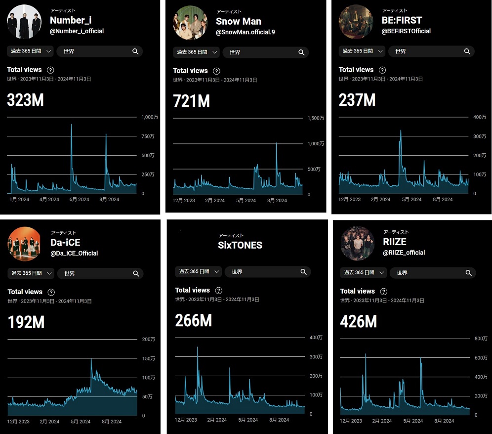 日本のアイドルグループ(主に男性グループ)でも、KPOPグループと似たようなグラフになる傾向がありまして、それが顕著なのが「Number_i」。一方、正反対なのが「Da-iCE」。