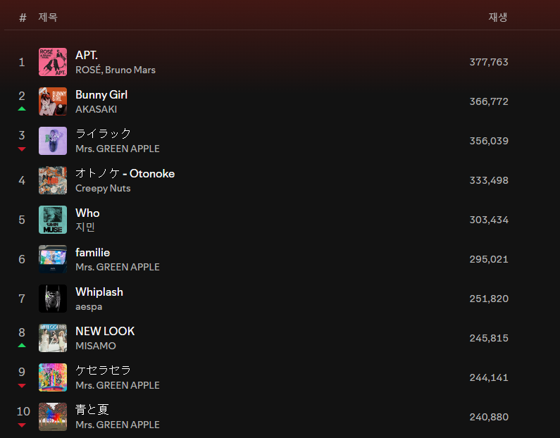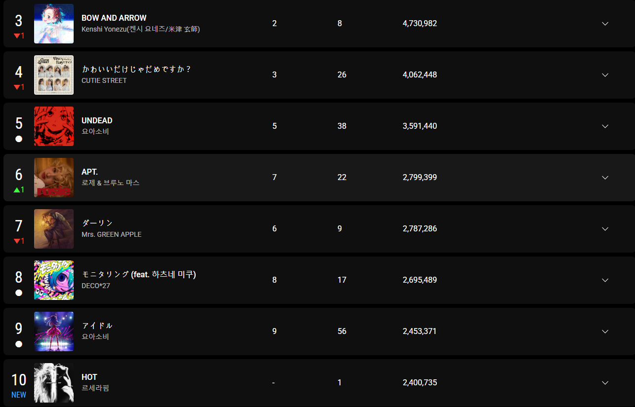 「APT.」の場合は、会社の存亡をかけた大金を注ぎ込んで、何とか維持しているけど、それ以外は、鳴かず飛ばず。楽曲ランキングでの再生数と、MVランキングでの再生数に乖離があるのは、日本の曲の場合は、カバー動画が多いからだけど、KPOPの場合は業者再生やファンダムの再生労働が多い為。