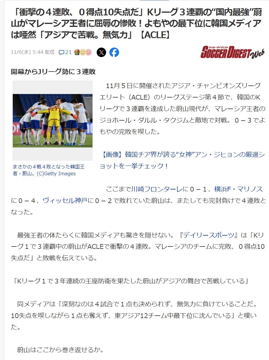 最強王者の体たらくに韓国メディアも驚きを隠せない。『デイリースポーツ』は「Kリーグ1で3連覇中の蔚山がACLEで衝撃の4連敗。マレーシアのチームに完敗、0得点10失点だ」と敗戦を伝えている。