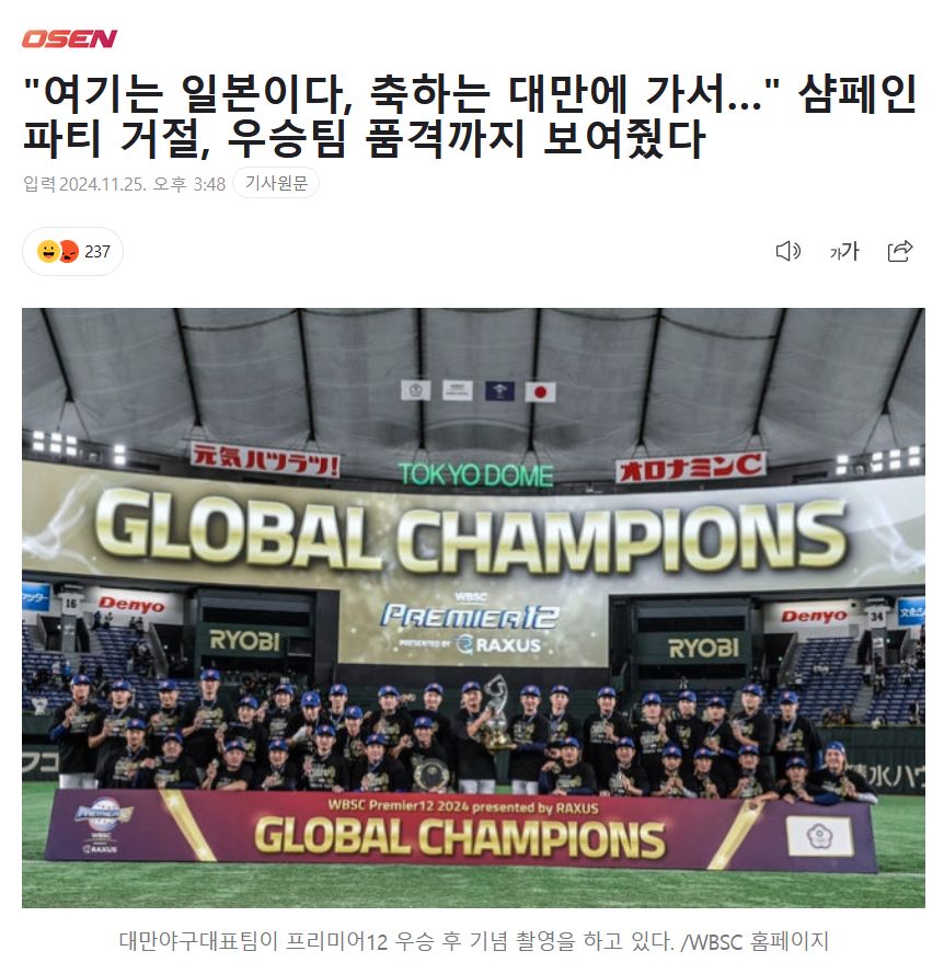 「ここは日本だ、祝う台湾に行って…」 シャンパンパーティー拒絶、優勝チームの品格まで見せてくれた