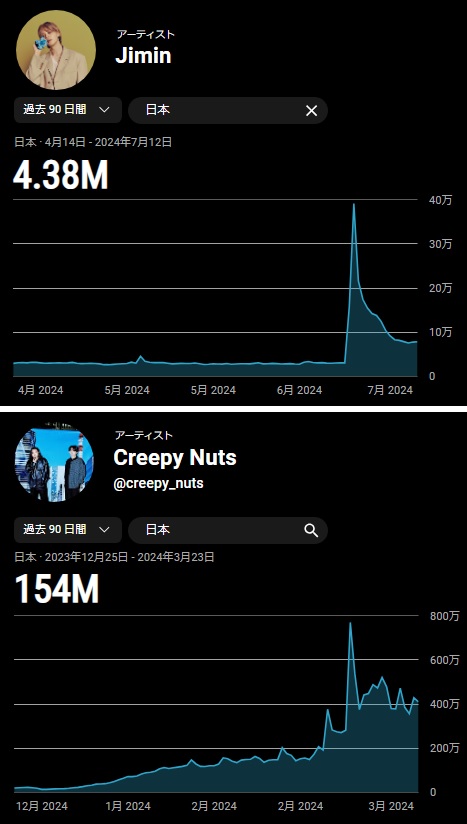 それまで地を這うようなレベルだったのが、新曲を出した途端に「垂直式」に増えている。今年、BTS のメンバー Jimin の新曲が公開された時も、やはり「垂直式」に増加。