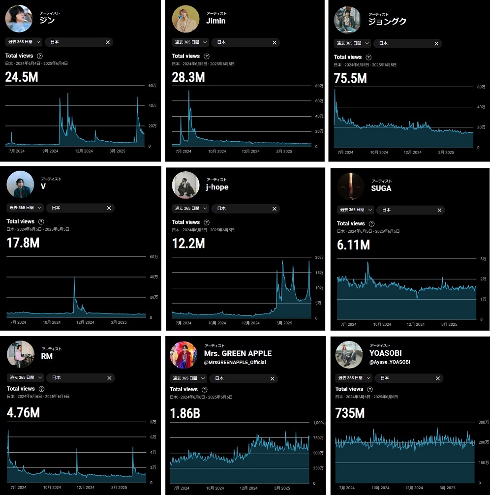 ところがさ、BTS の場合は、新曲発表時に10倍空回しは当り前、普段でも熱心なファンが再生活動をしたり、定常的な業者再生がずっと続いていて、実視聴は数分の一。それなのに、まあまあ名の知られているアーティスト程度ということは、実際に聴いているファンの人数は、人気アーティストのレベルに達していないってことなんだよ。>>224